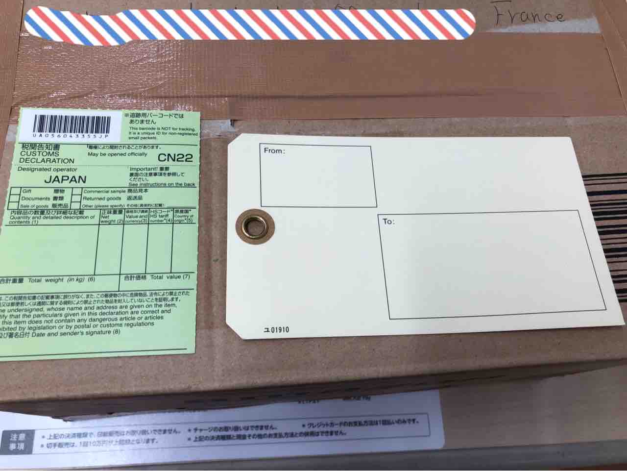 箱の側面には、税関通知書と住所を書いたタグを印刷したものが貼り付けられていました。