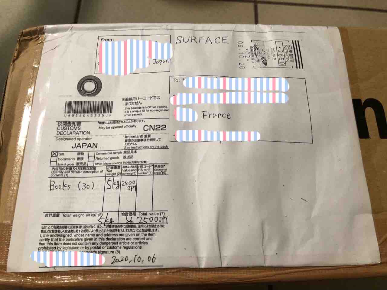 10月6日に送って、12月8日にフランスの自宅に届きました。