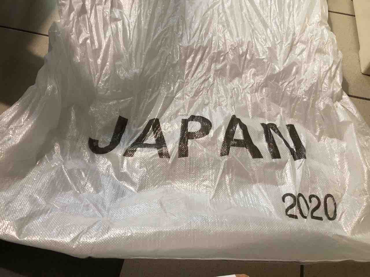 到着したら、ビニールっぽい素材でJAPAN2020と書かれた大きな白い袋に入ってて、口が頑丈に縛られて到着しました。
